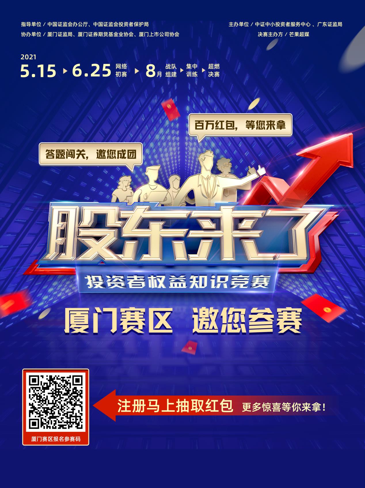 2021年是“十四五”規(guī)劃開局之年,為進(jìn)一步落實證監(jiān)會黨委關(guān)于資本市場人民性要求和保護(hù)投資者合法權(quán)益的職責(zé),在會辦公廳、投保局指導(dǎo)下,投服中心將聯(lián)合廣東、四川、湖北、內(nèi)蒙古、海南、西藏六證監(jiān)局共同舉辦《股東來了》2021投資者權(quán)益知識競賽,面向廣大中小投資者普及權(quán)益知識,示范引領(lǐng)全面知權(quán)、積極行權(quán)、依法維權(quán)。